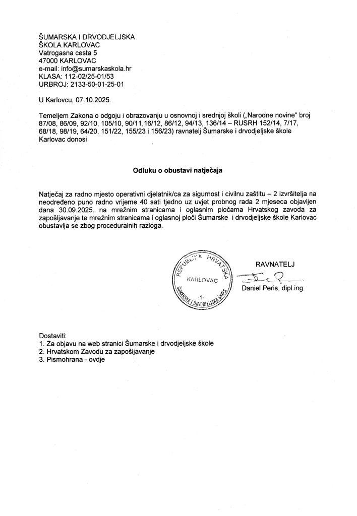 Odluka o obustavi natječaja za radno mjesto djelatnik/ca za sigurnost i civilnu zaštitu nalazi se u privitku ove objave.