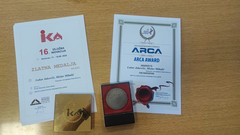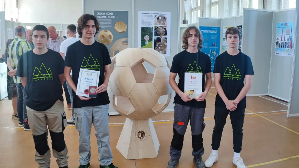 Ove godine imali smo puno razloga za slavlje jer je naš MODEL DRVENE NOGOMETNE LOPTE izrađene na CNC-u privukao puno pažnje te je od strane ocjenjivačkog žirija nagrađen sa ZLATNOM MEDALJOM.U izradi lopte sudjelovali su naši sada već bivši učenici koji su maturirali u školskoj godini 2024.-2025. – Lukas Jakovčić i Mislav Mihalić sa mentorima Goranom Mučenskim i Dejanom Benkom.